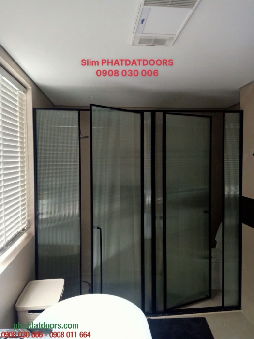 Khung nhôm Slim siêu mảnh kết hợp kính mờ sọc mang đến vẻ đẹp tối giản, hiện đại mà vẫn giữ được độ riêng tư cần thiết.